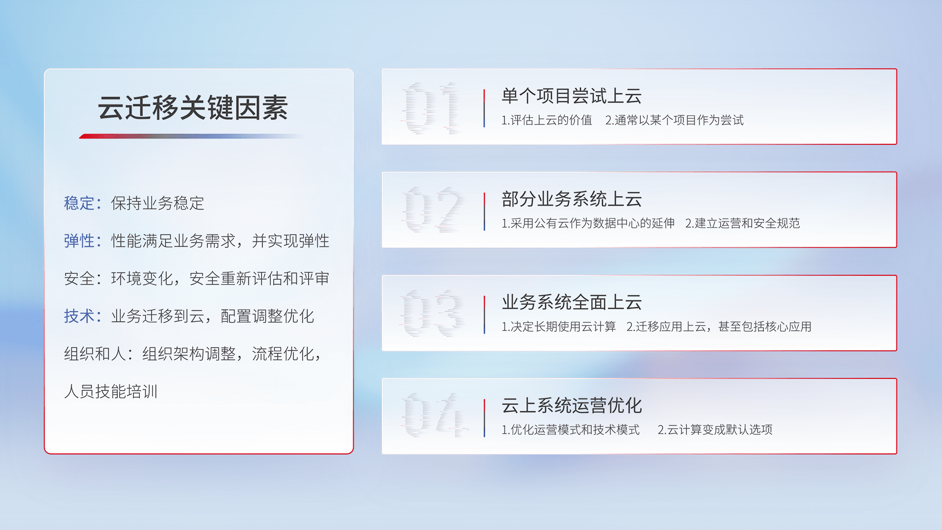 结合实际业务,,从规划设计、、、、云平台选型、、、、云原生改造、、、数据迁移、、、、集成交付,,迁移全过程为客户识别最佳上云路径,,做好风险识别管理,,,设计网络架构、、身份权限、、、安全审计合规、、、、操作审计、、、日志审计、、监控告警策略、、、、多站点容灾设计等,,,,对云上基础设施进行整体规划,,,提升IT治理水平,,,,以满足弹性、、高可用、、高性能的需求。。