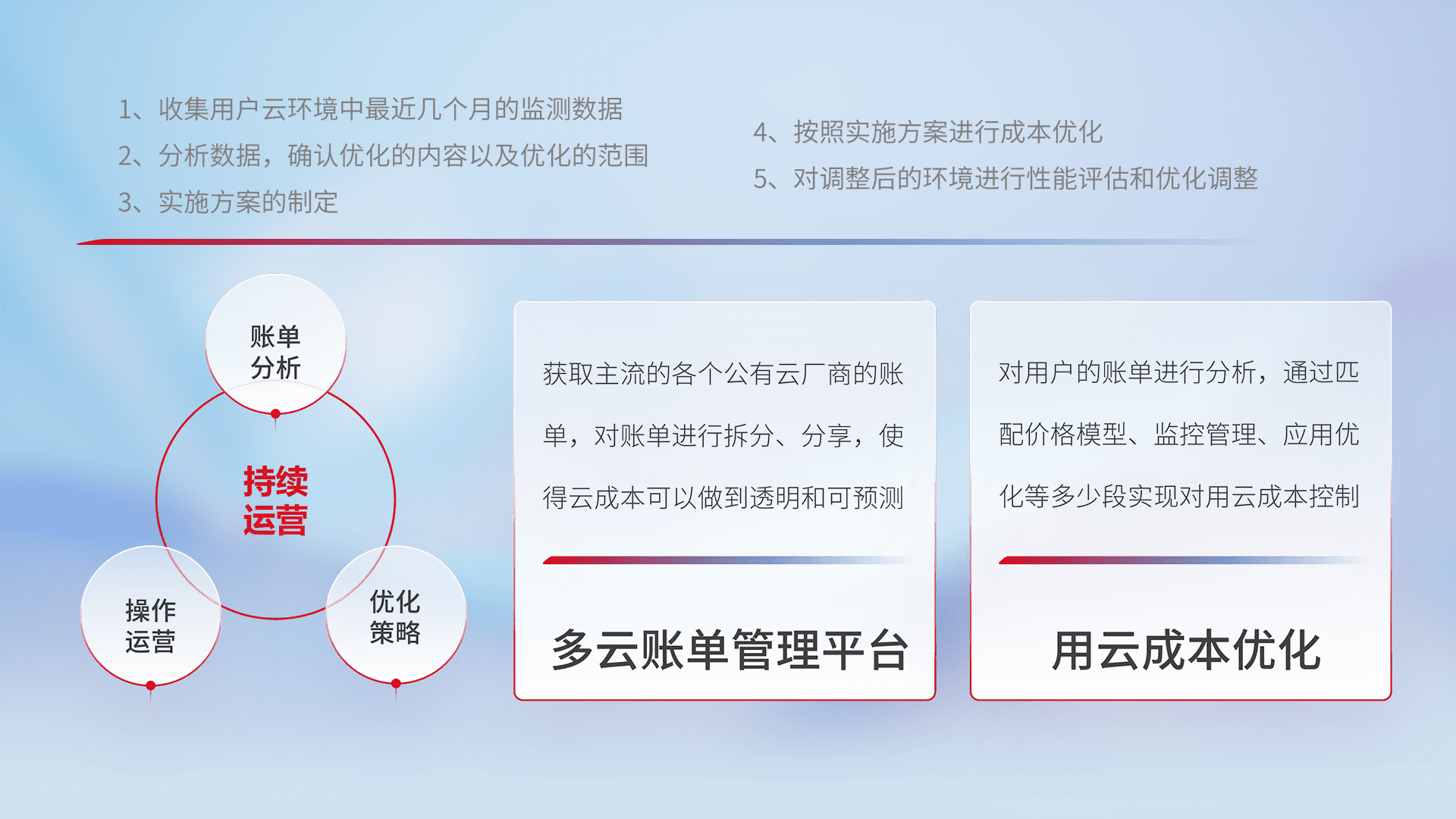 通过多云纳管,,以统一的资源数据模型把客户的云资源进行抽象和封装,,,进而实现对多云资源的统一操作,,,保障云资源管理的可靠性、、稳定性与可用性。。。。量身定制化运维内容,,,,配置、、开发运维、、补丁管理、、备份、、、、监控、、、认证和访问管理、、、审计和日常巡检等,,,,保障在用云过程中的可靠度,,,,稳定度以及高可用率。。。